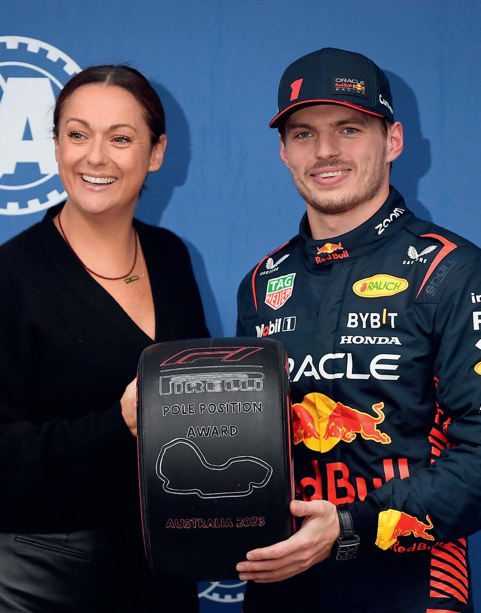 Max Verstappen received his pole position trophy from local comedian Celeste Barber before the 2023 Australian Grand Prix