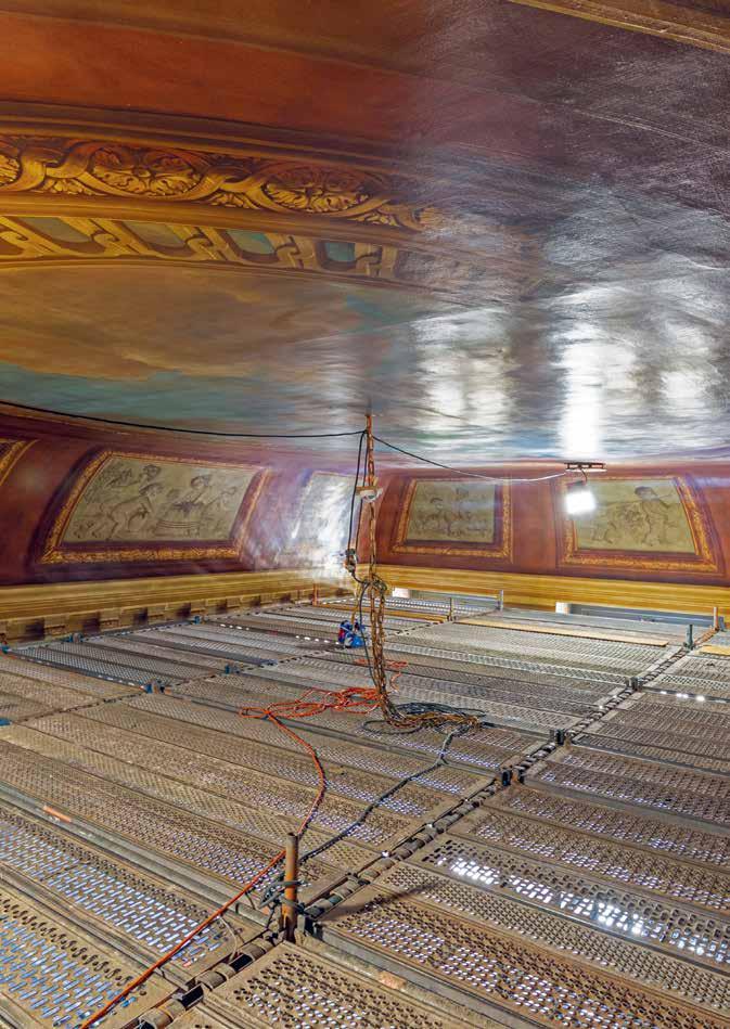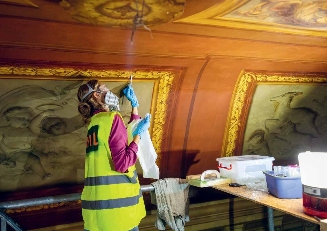 The ceiling as seen from scaffolding during conservation work in 2020. Restoration work on the east wall in the 1980s (p. 90–91).