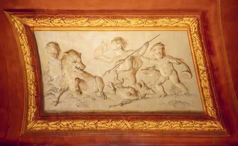 A painted relief showing a scene with putti hunting. The painted ceiling above the staircase.