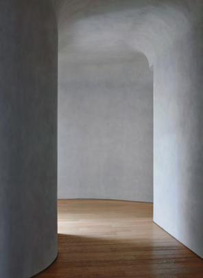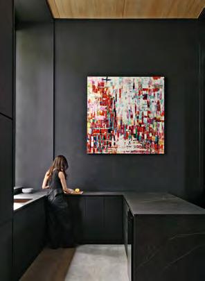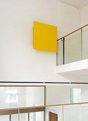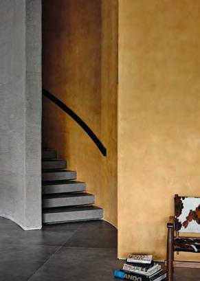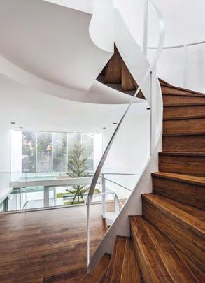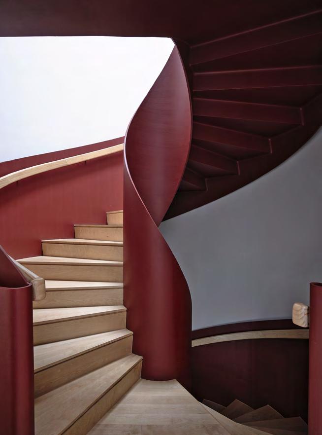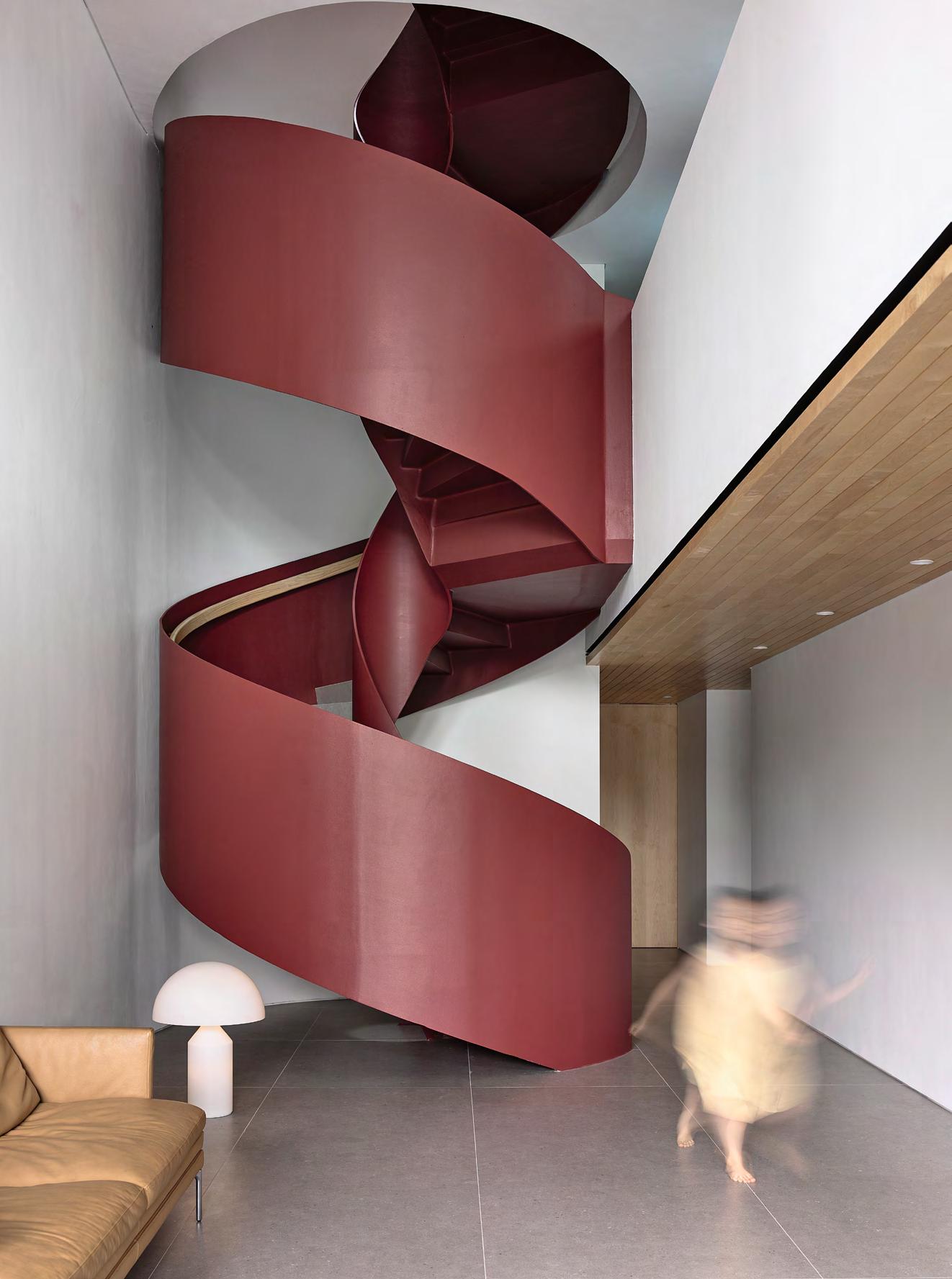 ◀ A defining feature as one steps into the house, the sculptural spiral staircase was originally black until the clients and their children voted for it to be spray-painted red.