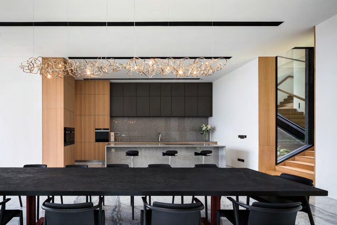 Located in the basement, the courtyard is a communal space carved out of the existing topography. Here, the basement is brightly lit and an impressionable focal point upon arrival, far from the common perception of basements being devoid of daylight. The courtyard and the house around it were designed with interrelationship in mind, where semblances of the surrounding green can be felt within the internal spaces. The landscape within the courtyard can thus be perceived as malleable as it creeps deeply into key communal spaces, making it perceivable from street level, redefining the archetype of an insular courtyard.