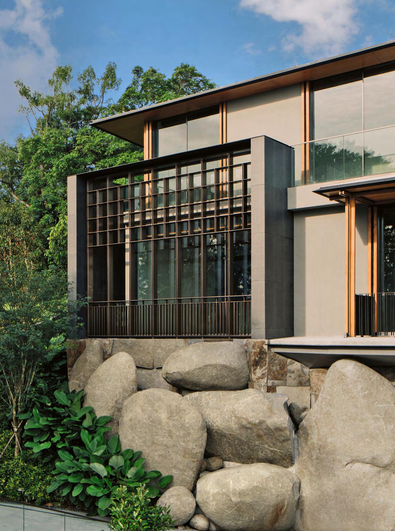 Nestle is designed to house four families the parents, their three children, and their respective families. The project was conceived as a fragmented mass inserted into the existing topography, with a landscaped courtyard unifying the separate masses and providing an outdoor space for communal interaction. Despite the challenges in addressing varying needs for the different families (typical for a multigenerational home), a prevalent desire for an idyllic communal living posited an opportunity to reexamine what it means to blur the boundaries between inside and out, embracing tropicality, and catering for gathering spaces that extend toward the outdoors.