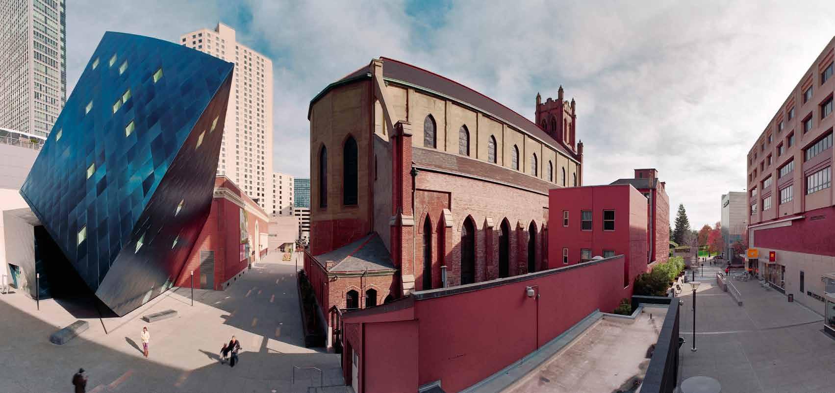 Time enters into Schiff’s pictures in a way that space cannot, for every photo automatically becomes a historical document the minute it is made, though sometimes we cannot see that until years have gone by. In Schiff’s case, certain changes have already become apparent. We are looking at the past when we contemplate his version of SFMOMA’s entrance hall, which has since been changed beyond recognition by the Snøhetta remodel (and how this photo makes me miss that old grayand-black-striped staircase!)(p.29). Or consider Schiff’s Brutalist-concrete version of the Berkeley Art Museum (p.85): it, too, is now gone, replaced by a sleek new Diller Scofidio + Renfro structure that, even without Schiff’s intervention, looks like something whose angles and dimensions have been radically distorted.