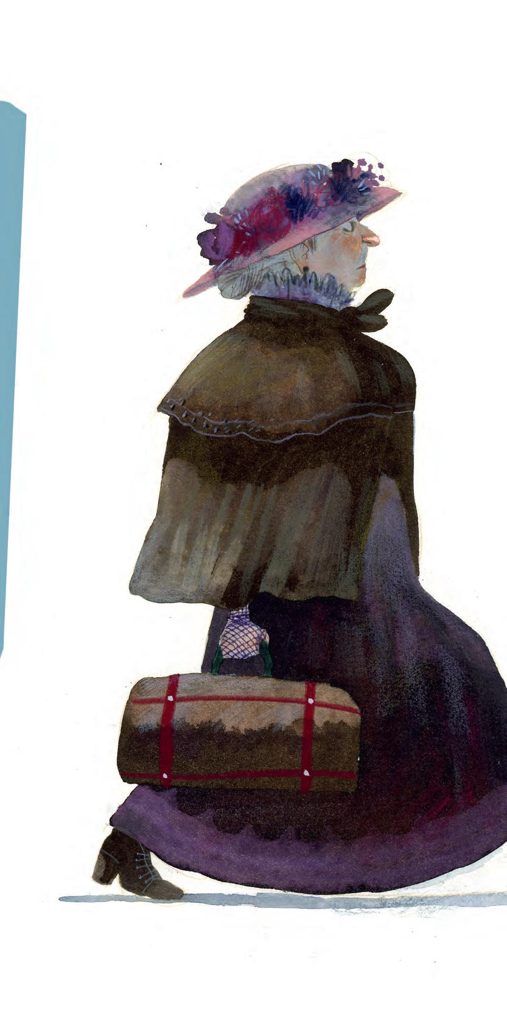 Upon her arrival in England, Mary was met by Mrs. Medlock, the housekeeper Mr. Craven had instructed to bring the child home. She was a stout woman, cheeks grown red in the cold as she waited, unimpressed, for the child to arrive. She was wrapped in a large mantle and wore a peculiar black bonnet, decorated with flowers, on her head.