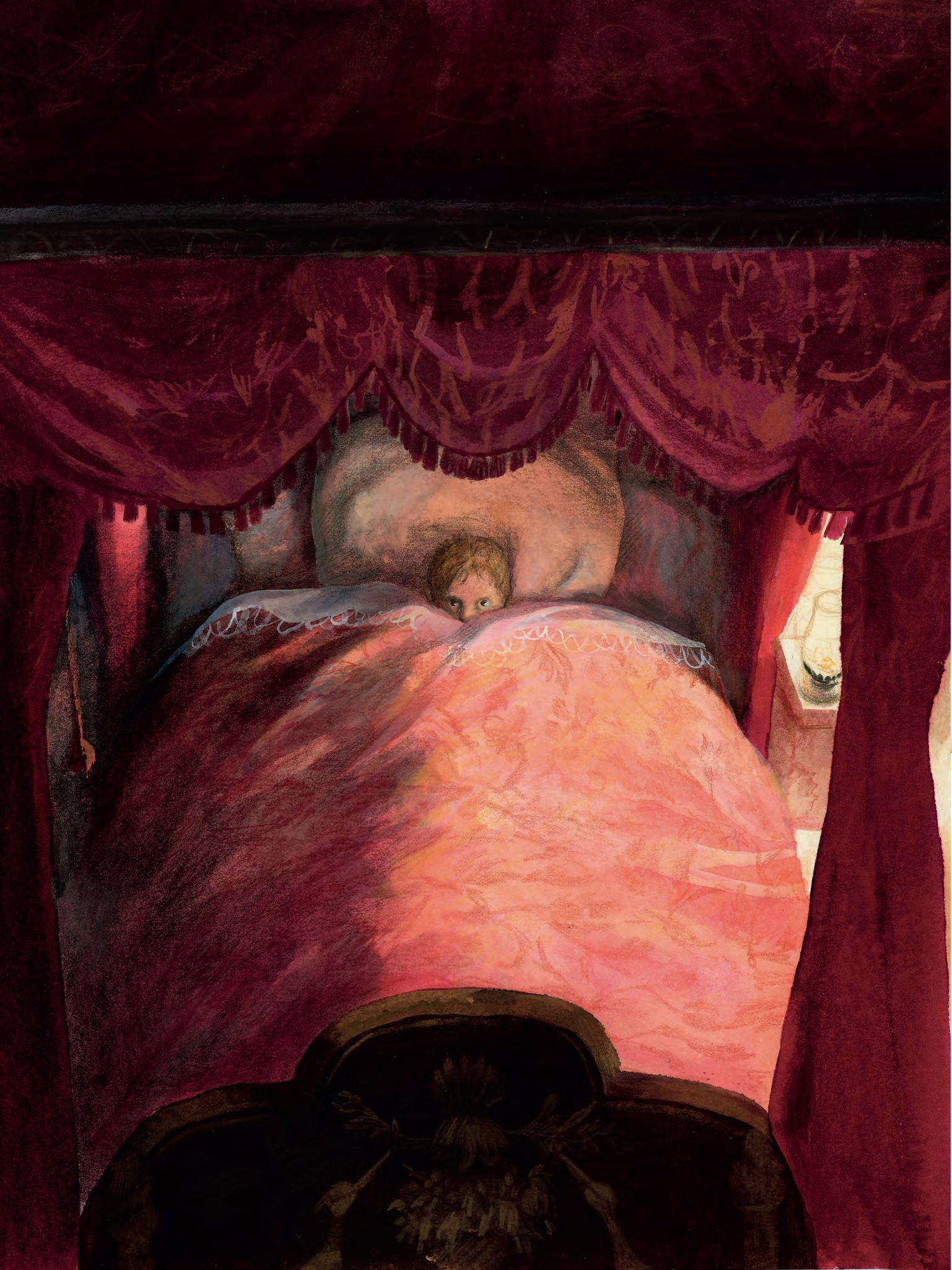 Without stopping to think, she lifted a burning candle and ventured into the darkness in the corridor, determined to find out who was crying. Mary had a good memory and she remembered exactly which passage Mrs. Medlock had come through that day. She made her way to it, found the door covered by tapestry, pushed it open and found herself in another corridor. She could hear the crying quite plainly now. She followed the sound into a handsomely decorated bedroom, in the middle of which stood a large four-poster bed. A boy lay on the bed, crying pitifully. Mary crept across the room and the light of the candle attracted the boy’s attention. He turned his head to stare at her and stopped crying. “Are you a ghost?” he asked in a frightened voice.
