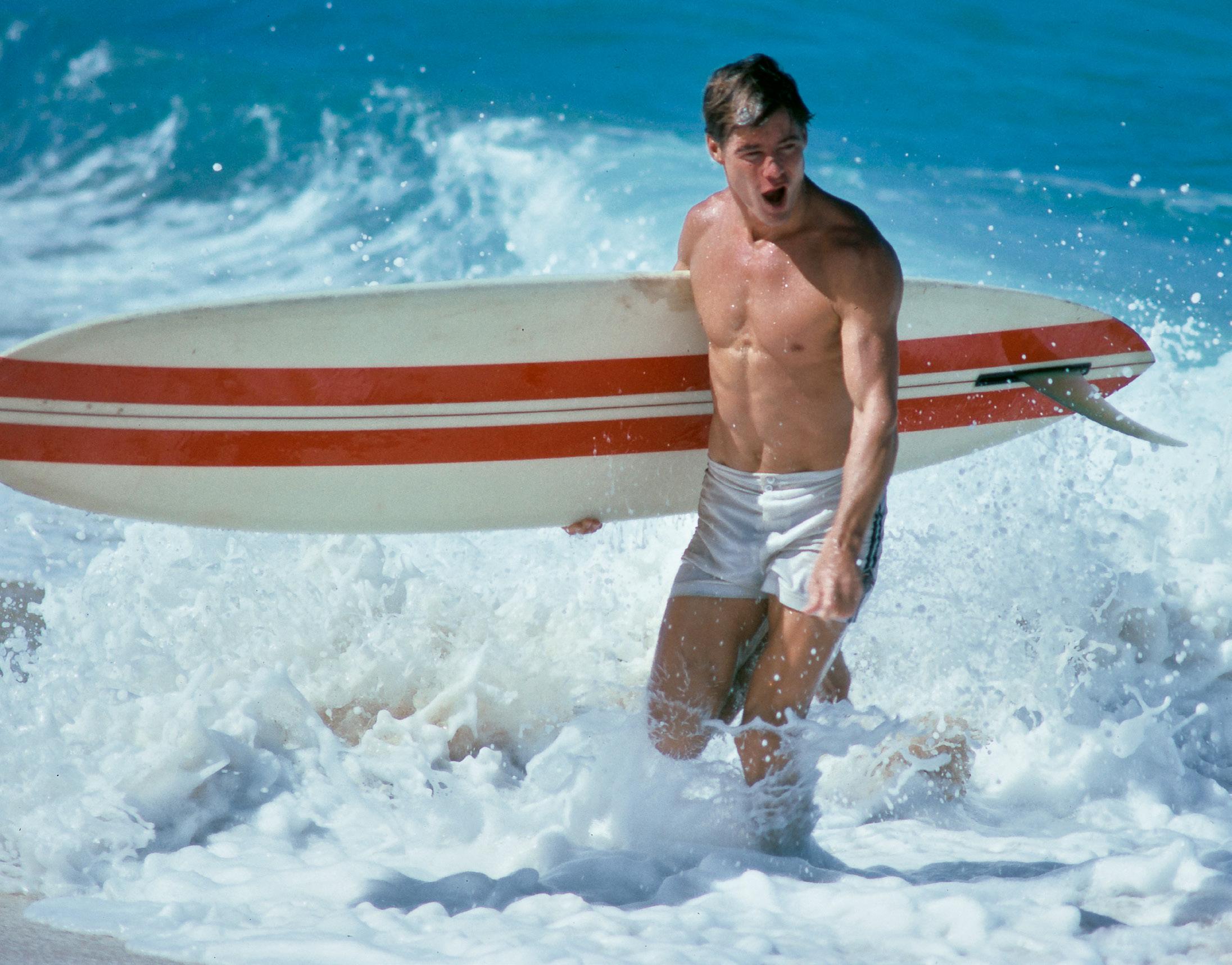 These pages: American actor Jan-Michael Vincent with a surfboard under his right arm on the set of BIG WEDNESDAY, at Sunset Beach, North Shore, O‘ahu, Hawai‘i, September 1977. Directed by John Milius, the American coming-of-age surfing drama starred Vincent as Matt.