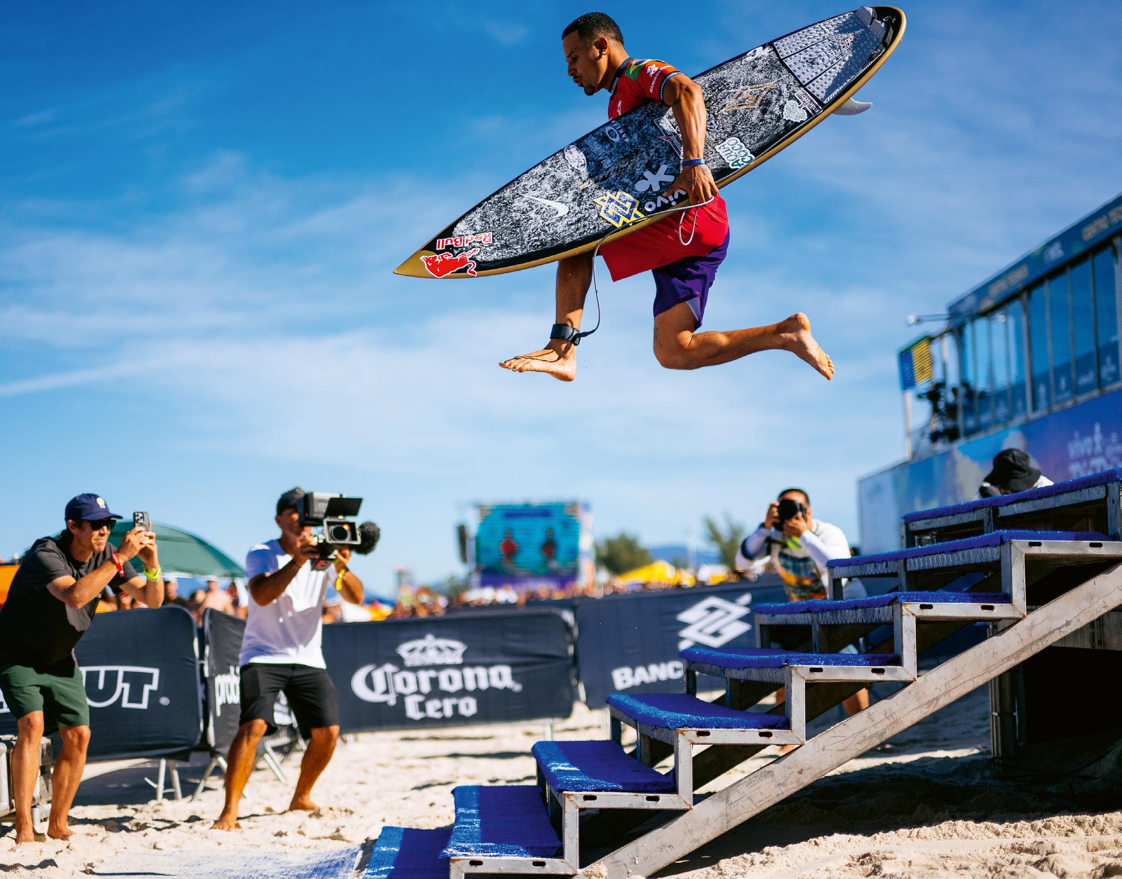 These pages: World and Olympic Champion Italo Ferreira of Brazil shows his air abilities on land prior to competing at the VIVO Rio Pro on June 29, 2025, at Saquarema, Rio De Janeiro, Brazil.