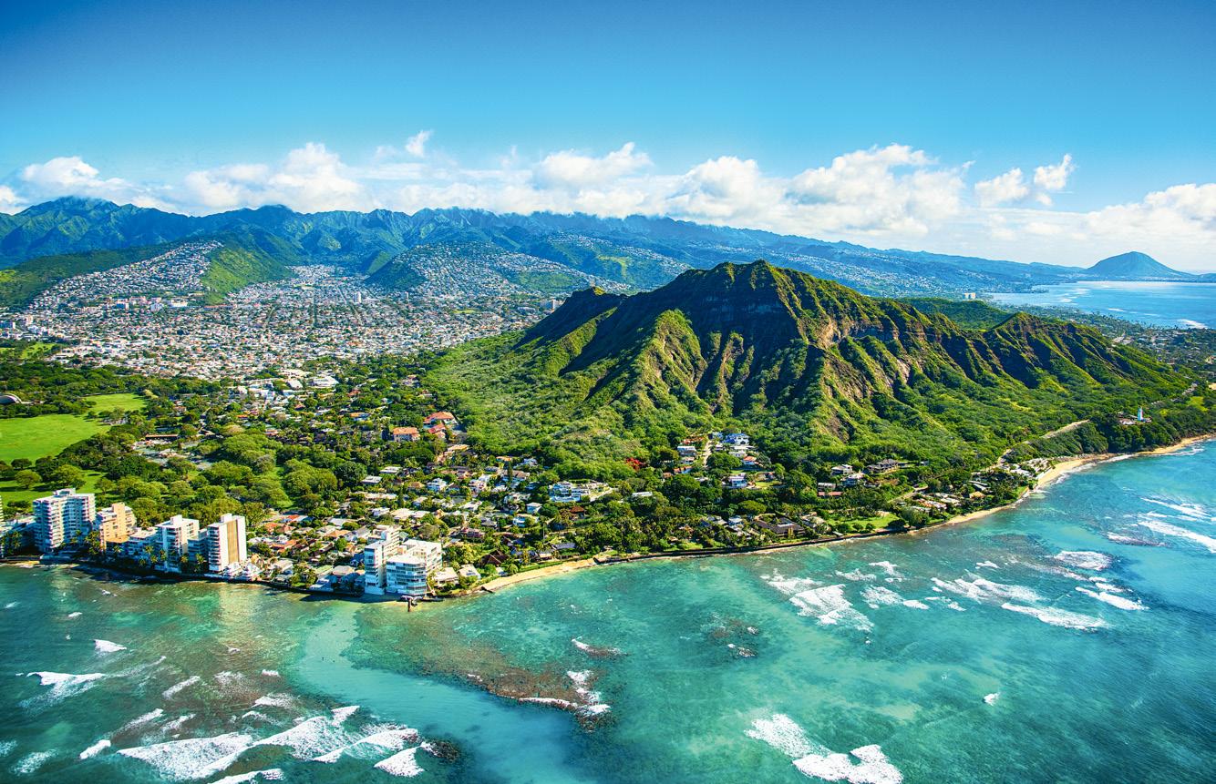 Opposite, top: The dormant volcano known as Diamond Head, located next to downtown Honolulu, Hawai‘i, photographed from an elevation of approximately 1,500 feet above the Pacific Ocean.