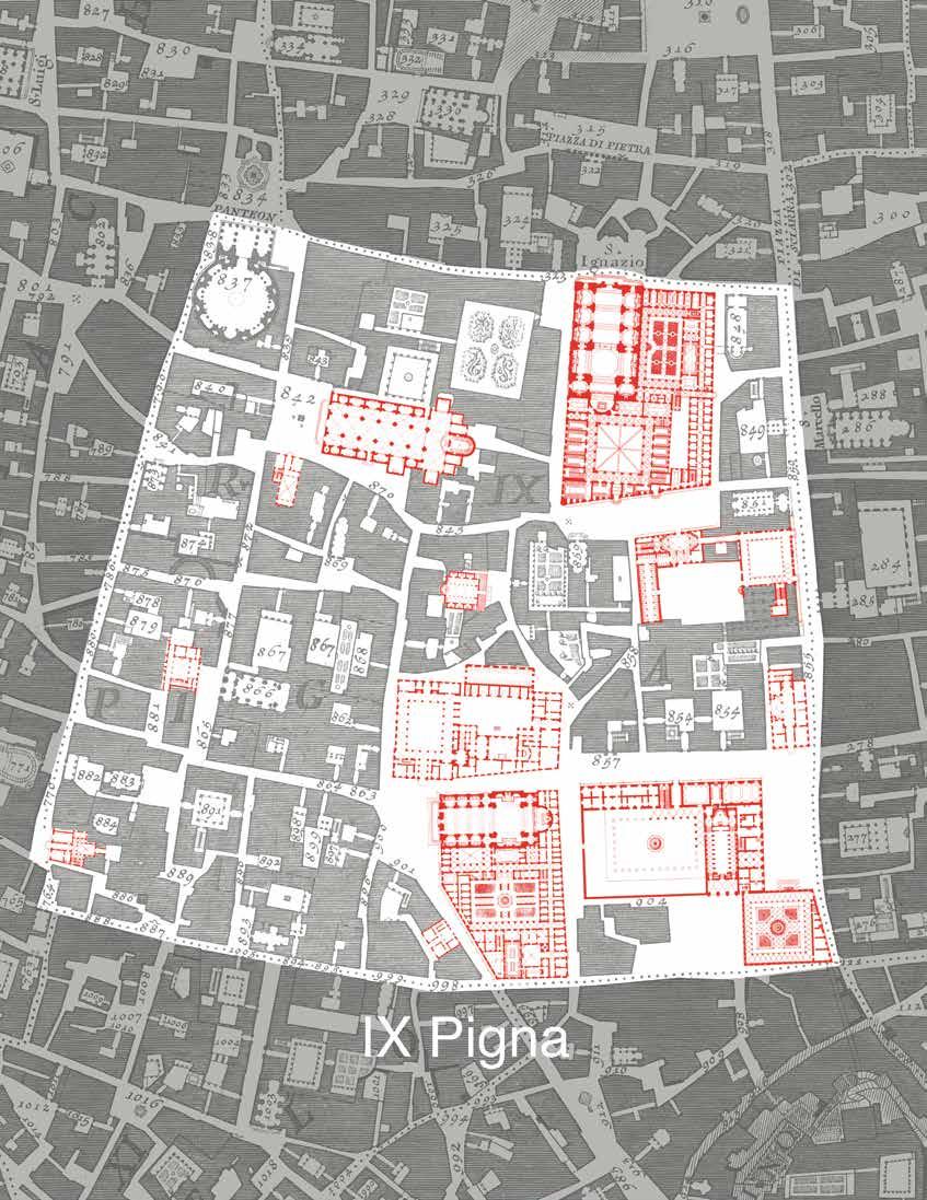 frontispiece: Detail, Rione IX Pigna, Pianta Grande di Roma, by Giambattista Nolli, 1748. Red inserts from Édifices de Rome Moderne by Paul Marie Letarouilly, ca. 1850. All graphics and photographs by the author unless otherwise noted.