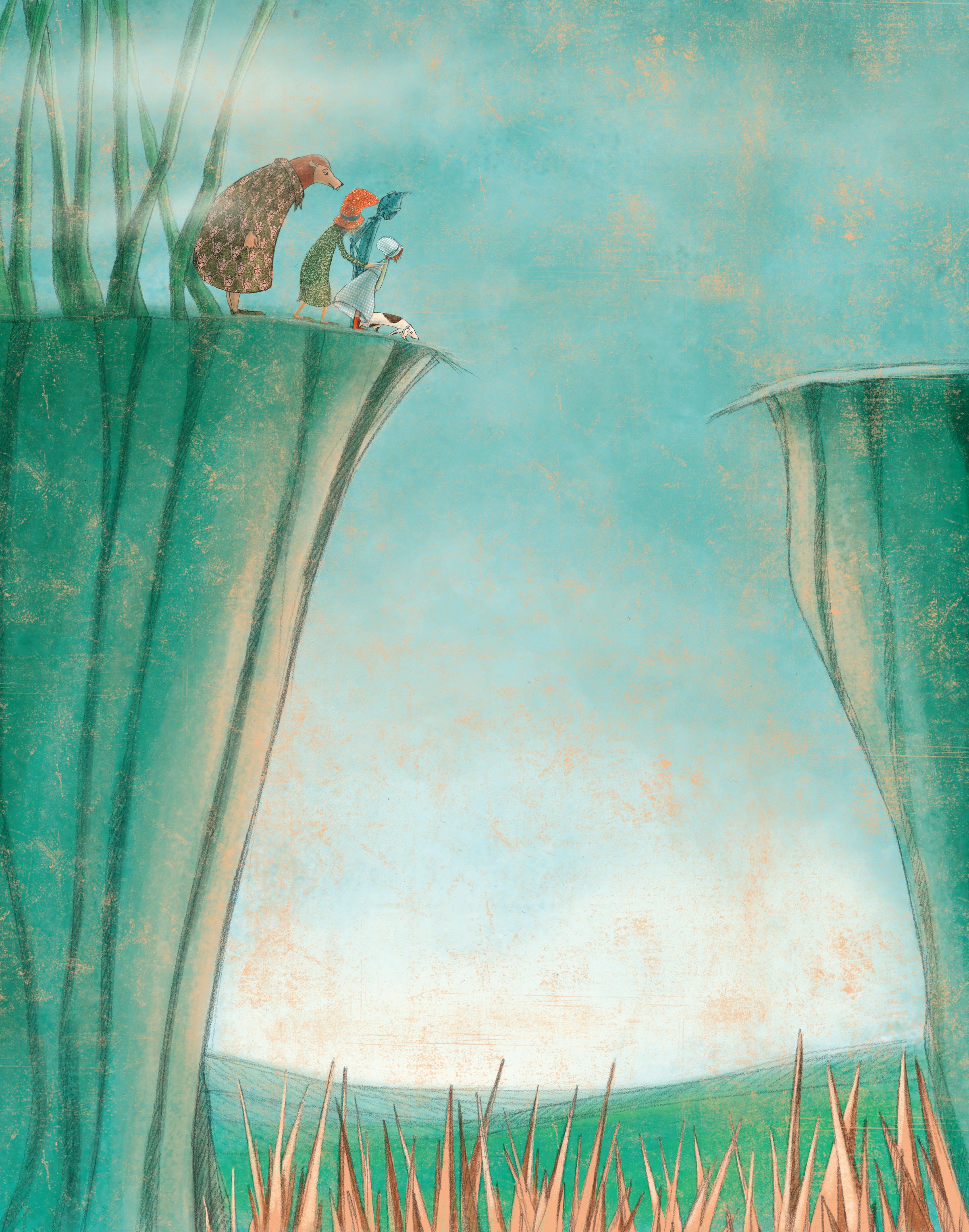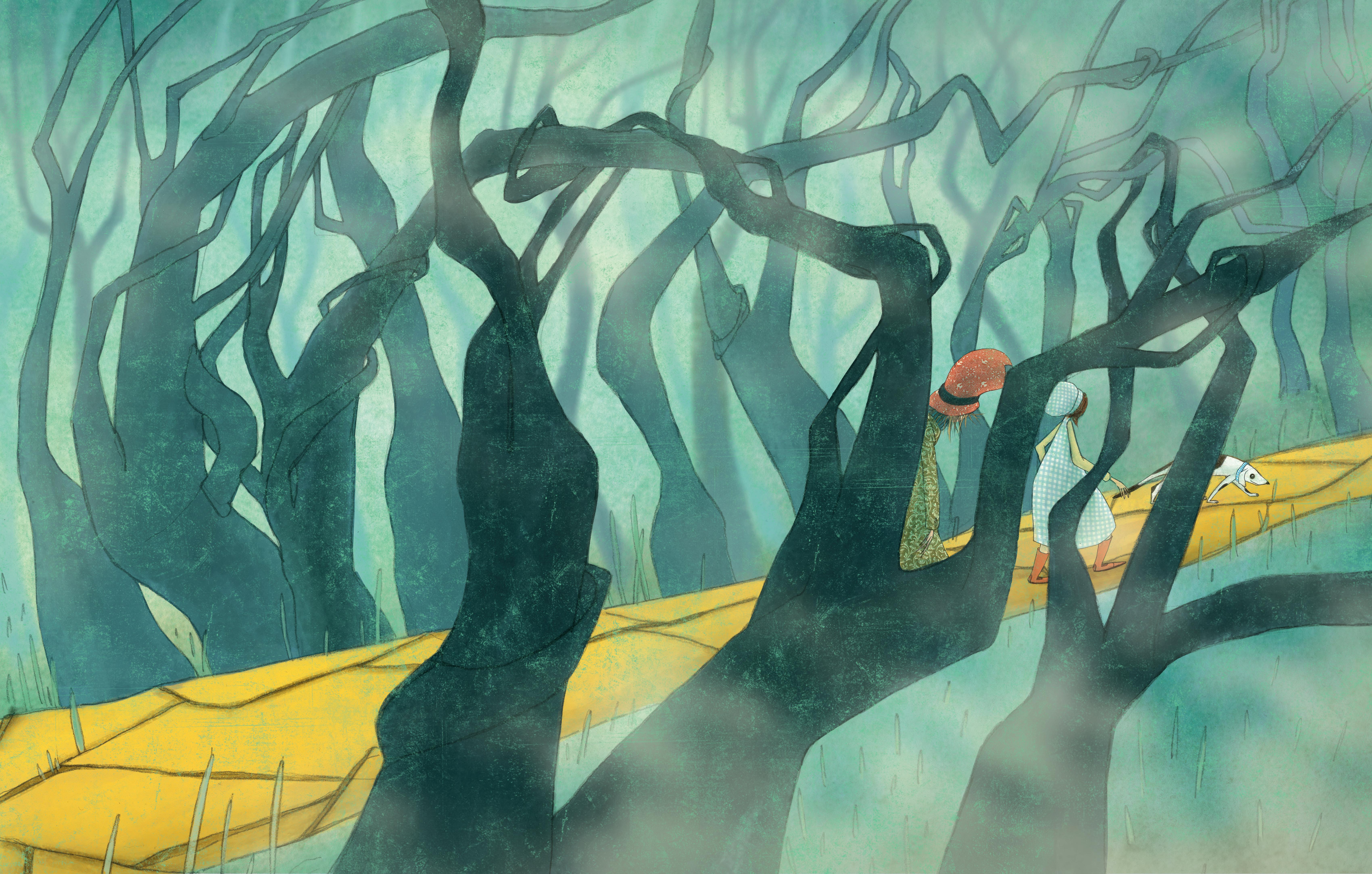 They had been walking for less than an hour when they reached a large chasm, very wide and very deep, with steep sides and sharp staves at the bottom. It divided the forest in two as far as the eye could see. They could see the yellow brick road continuing on the other side, but it seemed impossible to reach it!
