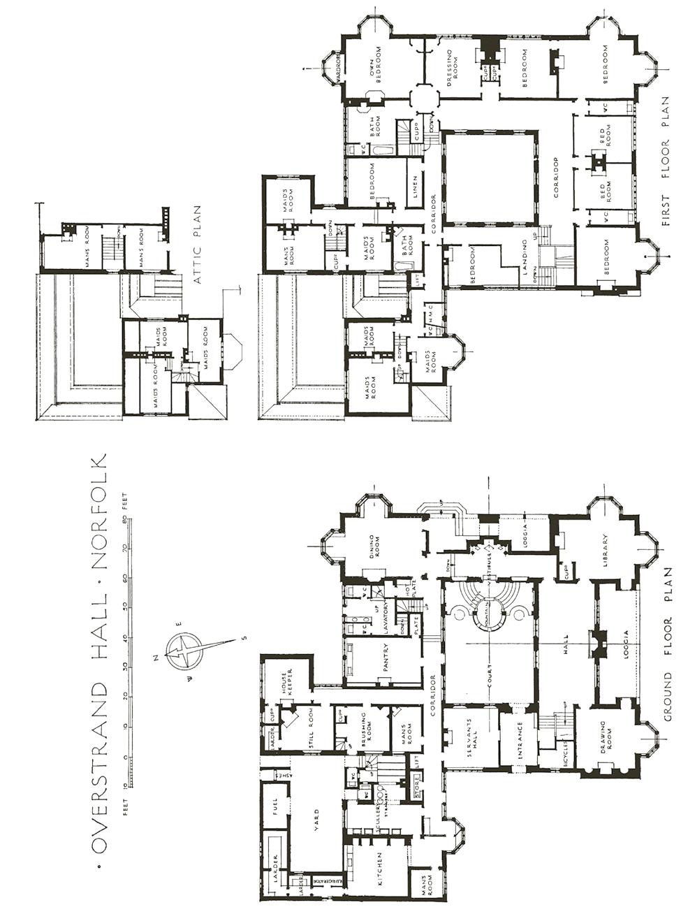 10. OVERSTRAND HALL, NEAR CROMER, NORFOLK: INTERIOR COURT 11. MAIN STAIRCASE 12. HALL FIREPLACE