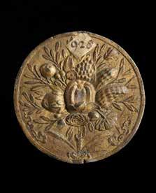 Below: fig. 8 Display of fruit, retaining the label from the 1685/86 inventory. South German, lead with gilding, c.1600–40. Diameter 6.4 cm. Given by Elias Ashmole in 1683. Ashmolean (WA 1908.47).