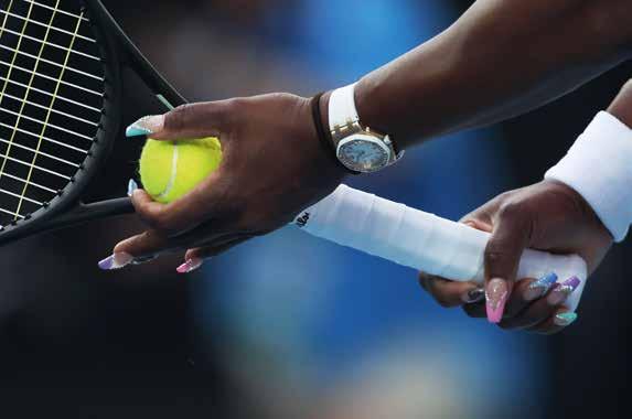 Certain locations provide particularly fertile soil for the production of watches. The small town of Glashütte in Eastern Germany is a good example. It is home to famous brands such as A. Lange & Söhne, Nomos and Glashütte Original. A similar phenomenon can be found in the Vallée de Joux in the Swiss Jura mountains, which earned the nickname of Valley of Inventors with some of the major players in the watch industry. They include Breguet, Blancpain, Jaeger-LeCoultre and Audemars Piguet. The latter’s top model, the Royal Oak, was launched in 1972. On this double spread Serena Williams is wearing a Royal Oak Offshore, which with its rubber bracelet and rose gold case combines elegance with sportiness. Like Williams, who in the course of her unparalleled career won 23 Grand Slam tournaments.