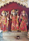In the centre is Rama, also known as Maryada Pursottam (the perfect man). On his left is his step-brother Lakshmana and on his right, his wife Sita. In his left hand Rama carries a giant dhanush (bow), which only he can lift, string and even break in two, according to legend. On his back he carries a quiver with four teer (arrows). Lakshmana carries a smaller bow on his left shoulder and a quiver with four arrows on his back. All three wear large crowns and are adorned with jewelled fineries. Rama and Lakshmana wear dhotis draped from their waists; Sita wears a sari.