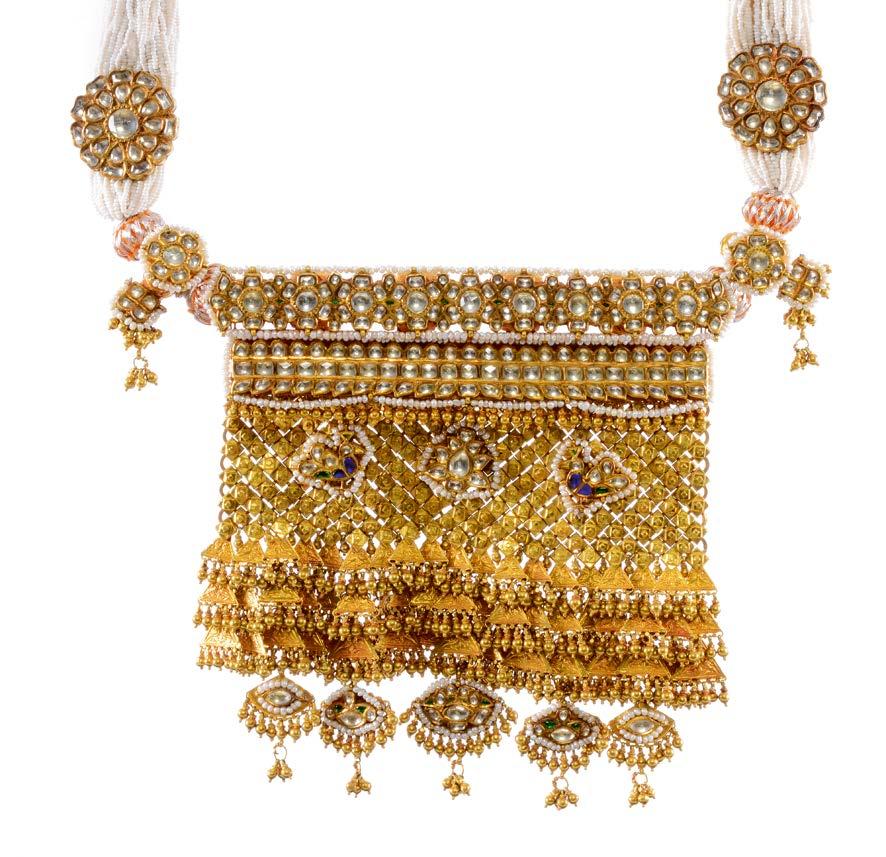 Gold tevta, elaborate traditional wedding necklace worn by brides. The rigid upper part is set with billore (rock crystal) on foil. On either side is a roundel with a square pendant. The lower flexible part (jhaler) is decorated with a flower in the centre and a bird on either side; all three are set with billore on foil, the bodies of the birds are blue glass. Five pendants (tansukh) set with billore on foil are suspended from the flexible jhaler. All decorations are bordered with tiny seed pearls. The tevta is supported with multiple strands of white chid (glass seed beads), adorned with a large gold rosette set with billore on foil.