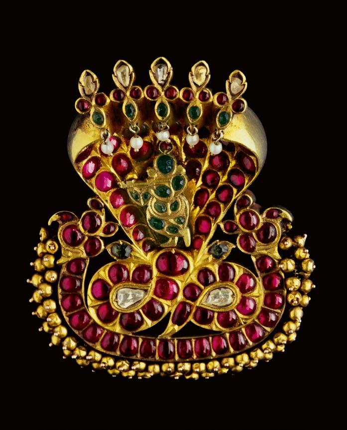 Gold upper part of a jadanaagam (hair braid ornament), depicting the thousand-headed cobra Shesha (also named Ananta), surmounted by a figure of Krishna dancing on the coiled serpent and holding up his flute to play. Krishna’s face is carved from an emerald and his body is set with emeralds; the gold hair ornament, ‘crowned’ with five diamonds, is set with cabochon-cut Burmese rubies, diamonds and emeralds, and has five pearls suspended at the top.