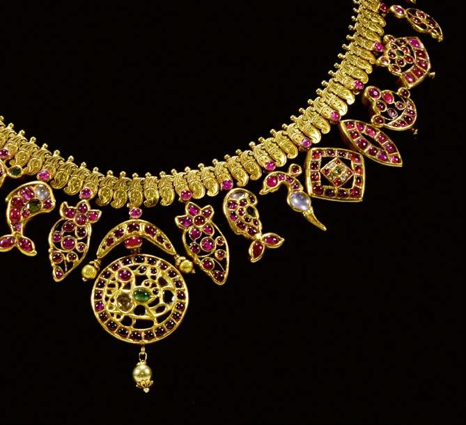 Necklace consisting of gold, stylised, mango-shaped ornaments, with nine different shaped gold pendants on either side (each with a different Vaishnavite symbolic meaning), and one crescentshaped central pendant, all set with cabochon-cut rubies, emeralds and white sapphires. From the half-moon shaped central pendant hangs a circular pendant depicting a hamsa (mythical swan or goose). The nine pendants represent symbols of Lord Vishnu; the hamsa in the central pendant represents the mythical swan or goose, the mount of Lord Brahma.