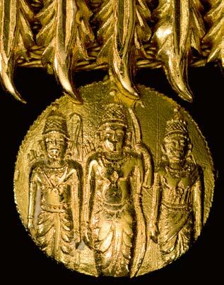 This kind of repoussé workmanship is characteristic of South India. The sheet gold is worked from behind and the design is raised in high relief to the front, filled with resin (lac) to support the thin gold, and a plain gold sheet covers the back.