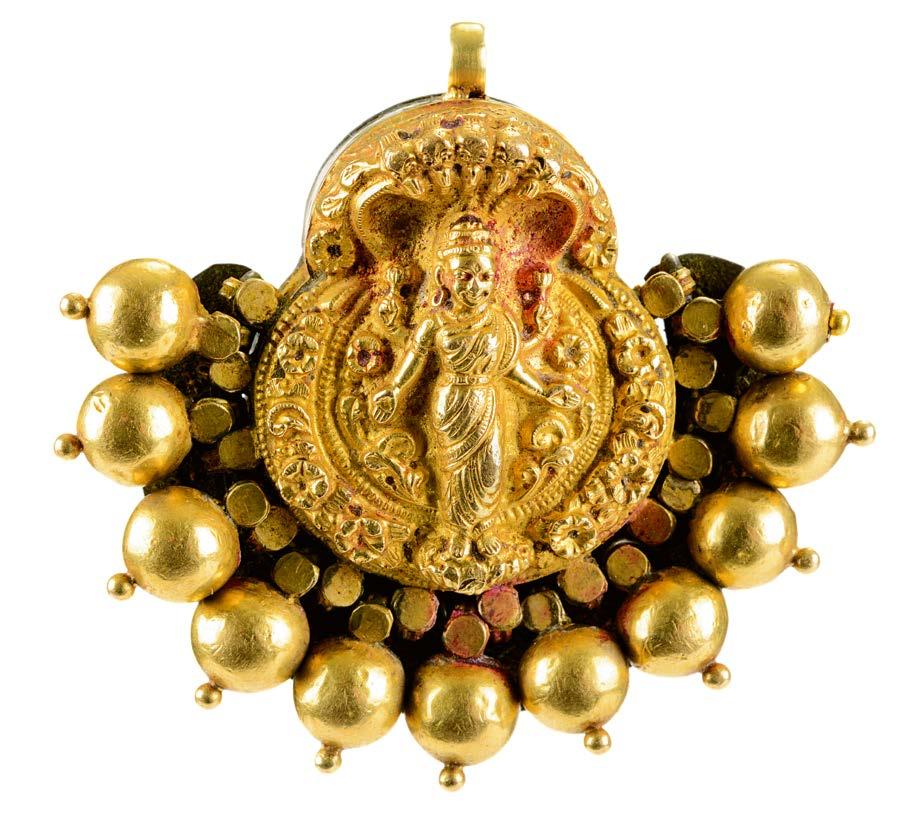 This gold repoussé head ornament, adapted to be a pendant, is backed with two inscribed silver plates. The interior is filled with lac. The object depicts the goddess Lakshmi, smiling and standing under the protection of a five-headed cobra, her two upper arms holding a blooming lotus flower in each hand and her two lower hands are shown in a boon-giving gesture. The goddess is elegantly crowned, and wears large earrings, bangles on her four arms and a jewelled belt. There is a garland decoration on either side. Twenty-three gold discs soldered to eleven gold balls are attached to the centrepiece.