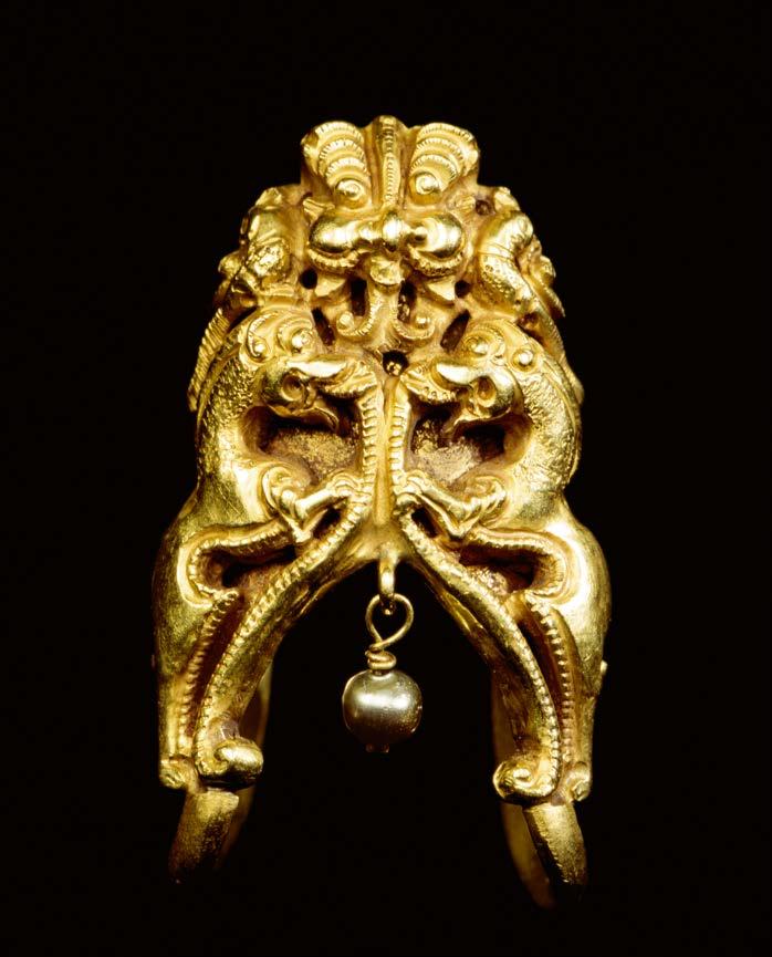 Gold, repoussé-work, V-shaped ring (nali) depicting a kirtimukha with a makara on either side. A gold bead is attached below by gold wire.