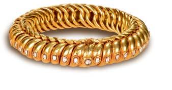 A pair of flexible gold bracelets, comprising a series of forty ingeniously entwined links, each decorated with a kundan-set flatcut diamond. An anti-clockwise screw clasp set with a diamond inserts into hinges fitted on both ends of the bracelet.