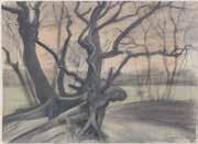 The reflection of the roots in the muddy pool and the stormy sky produced theatrical effects which he tried to capture in his drawing. The labourers in the background are merely extras; the roots are the stars here.