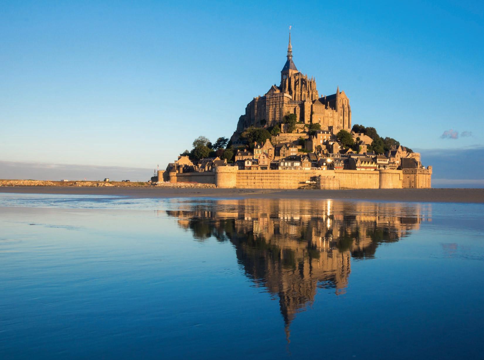 It seems to float on the surface of the ocean, perched on a pointed cliff surrounded by sand and water. One of the three most-visited places in France, the Benedictine abbey of Mont-Saint-Michel is a Gothic wonder on the border between Normandy and Brittany, a miniature world which defies gravity, closely connected to the bay that surrounds it. Indeed, the powerful tides have made it possible for this church, dedicated to the archangel Michael, to stand up to the attempted invasions of the English over the centuries. As the water ebbs and flows “at the speed of a galloping horse” (according to a local saying), the church, its tall spires and the Tudor-style hamlet gathered at its feet are either connected to or isolated from the mainland.
