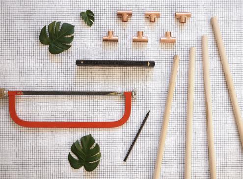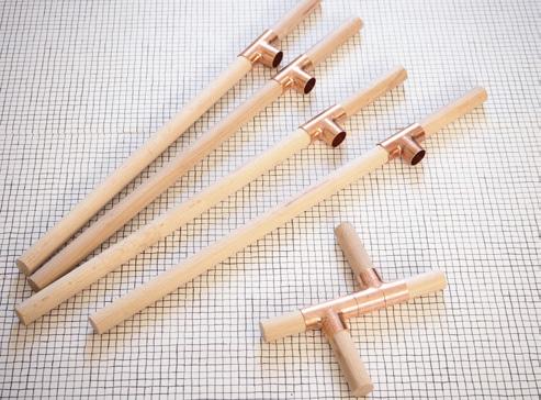 The cross for the centrepiece is made with five pieces of wood and two copper T-connections. The length of the individual wooden sticks will be determined by the size of your plant pot.