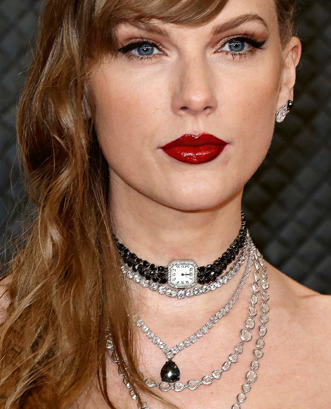 Opposite. Taylor Swift arrives for the 66th Annual Grammy Awards wearing a Lorraine Schwartz choker with a Concord watch set to 12 o’clock in reference to her 2022 studio album Midnights