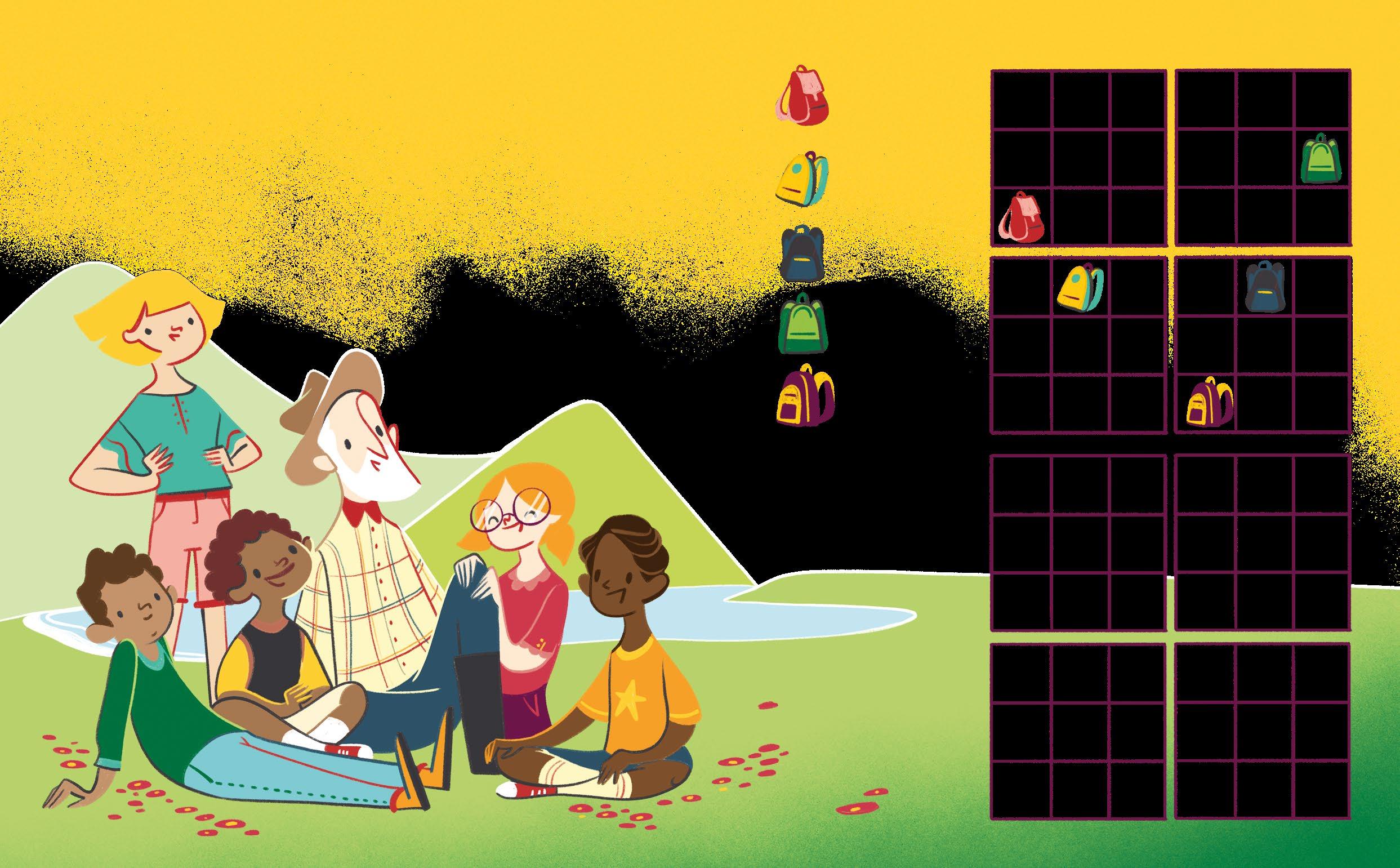 He takes their backpacks and places them on a grid. He tells them all to LOOK CAREFULLY, and then he covers the backpacks with a towel. You look at them, too, and then cover them with your paddle.