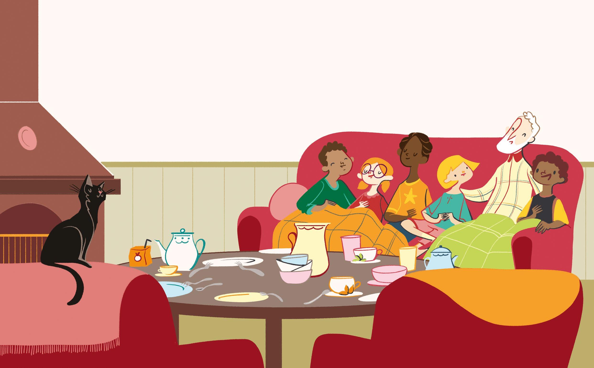 The next day, LIS and HARU are hanging out with their friends Ravi, Lucrezia, and Miguel. Grandpa suggests they play a game.