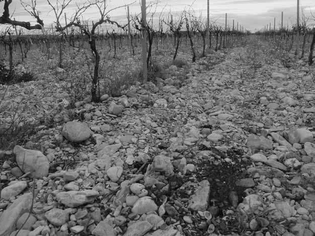 The Rhône, here not restricted by the Massif Central, has changed its snaking course over millennia, switching paths like channels of rain down a windowpane. Although only the fourth longest river in France, it is powerful and fast moving, bringing vast amounts of debris on its journey from the Alps, including the emblematic pale-brown stones known as galets roulés that have been rounded and polished over centuries by rivers and glaciers. I’ll continue to use the French term galet roulé in this book as there is no direct translation in English; the closest approximation would be ‘cobblestone’ but this brings to mind something smaller and more uniform. Galets roulés vary in size, typically anything from a hen’s egg to a human head, occasionally even larger, and they vary in colour from cream to brown to crimson. They are most commonly associated with Châteauneuf-du-Pape, but deposits from various sources are found all over the Southern Rhône.