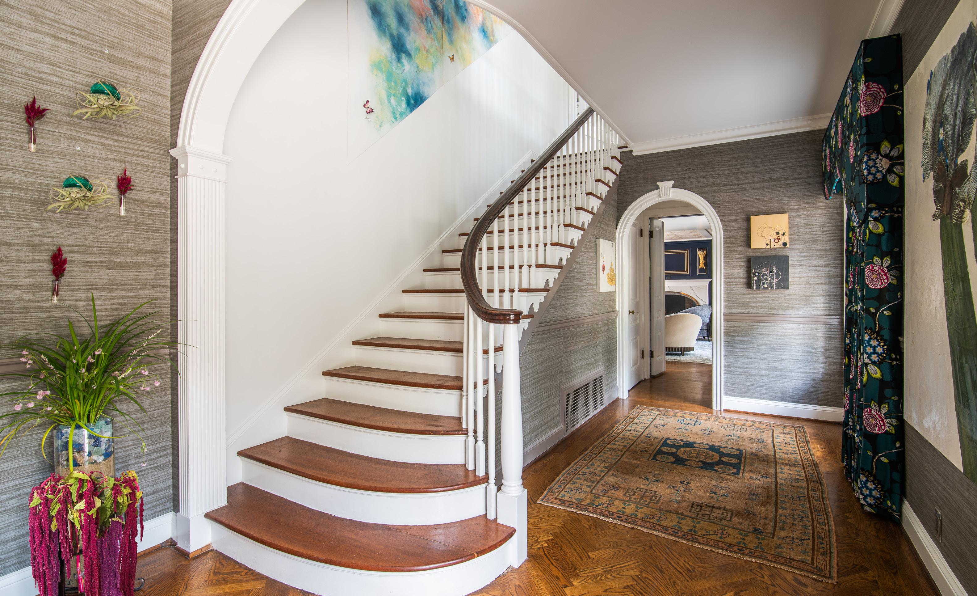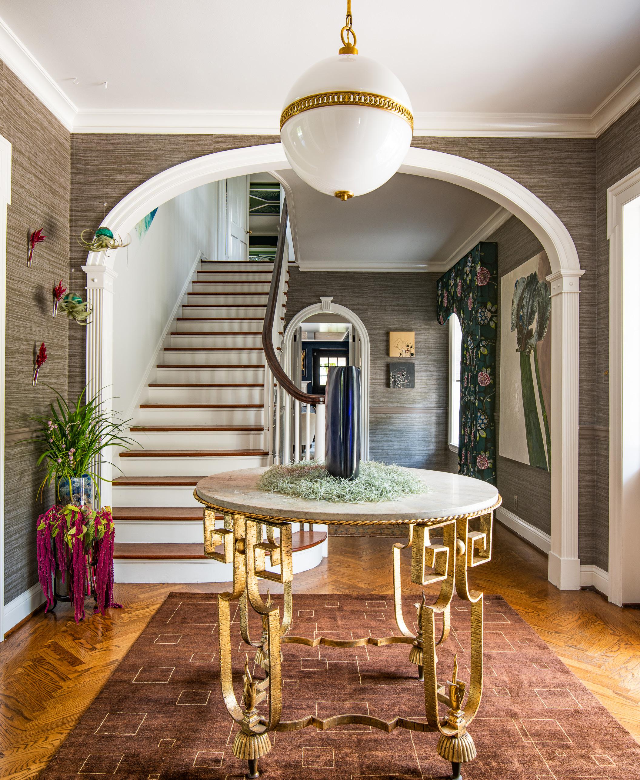 Designer Christine Jahan pulled out all the stops when renovating this charming Federal-style house in Pasadena, California. She filled the home with light, colour and art, creating a richly layered space that she describes as ‘natural class’. For the wallcovering that was used across the open-plan ground floor, Jahan opted for a ‘multidimensional grey wallpaper with subtle hints of pink,’ she says. ‘The texture livened up the walls, contrasting beautifully against the high-gloss white trim.’