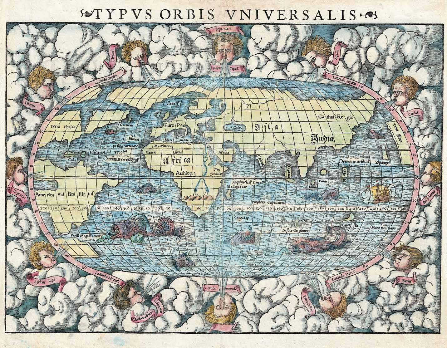 Twelve wind heads, one for each direction, and multiple sea monsters enliven this famous map of the world. Well-known among educated Europeans of the 16th century, this map was included in one of the most popular and influential books of its time, Sebastian Münster’s Cosmographia. Considered to be the first description of the world in the German language, it was later published in many other languages including Latin, French, Czech, English, and Italian.