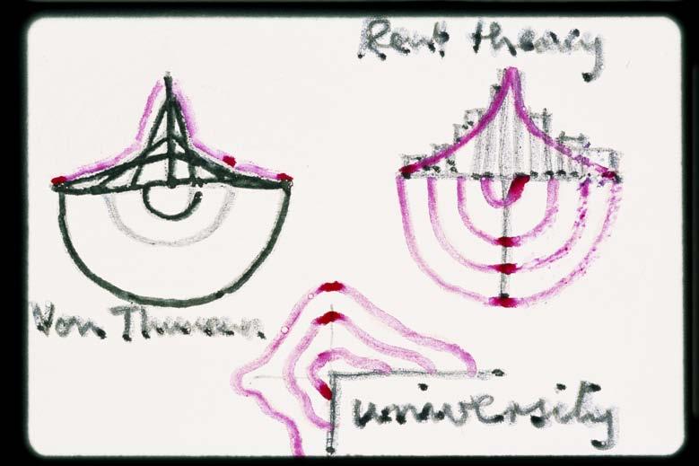You could take this system into a living room and ask what all these elements represent in a living room -- or you could take it into New York and ask what do they mean there. In New York you have to deal with where the highest density should be, what size sites people are looking for, what size sites are needed in the future, what growth should be permitted and which prevented. If you allow for a building on this site now and you don’t want it to invade everything around it, you allow channels for where it can grow and channels for where it can’t. So you are allowing for the uncertainty of growth but you’re channeling it. If you don’t want something very important -socially or historically precious -- to be swept away, you find ways to allow access where you want a lot of people to be and limit access by what you want to protect.