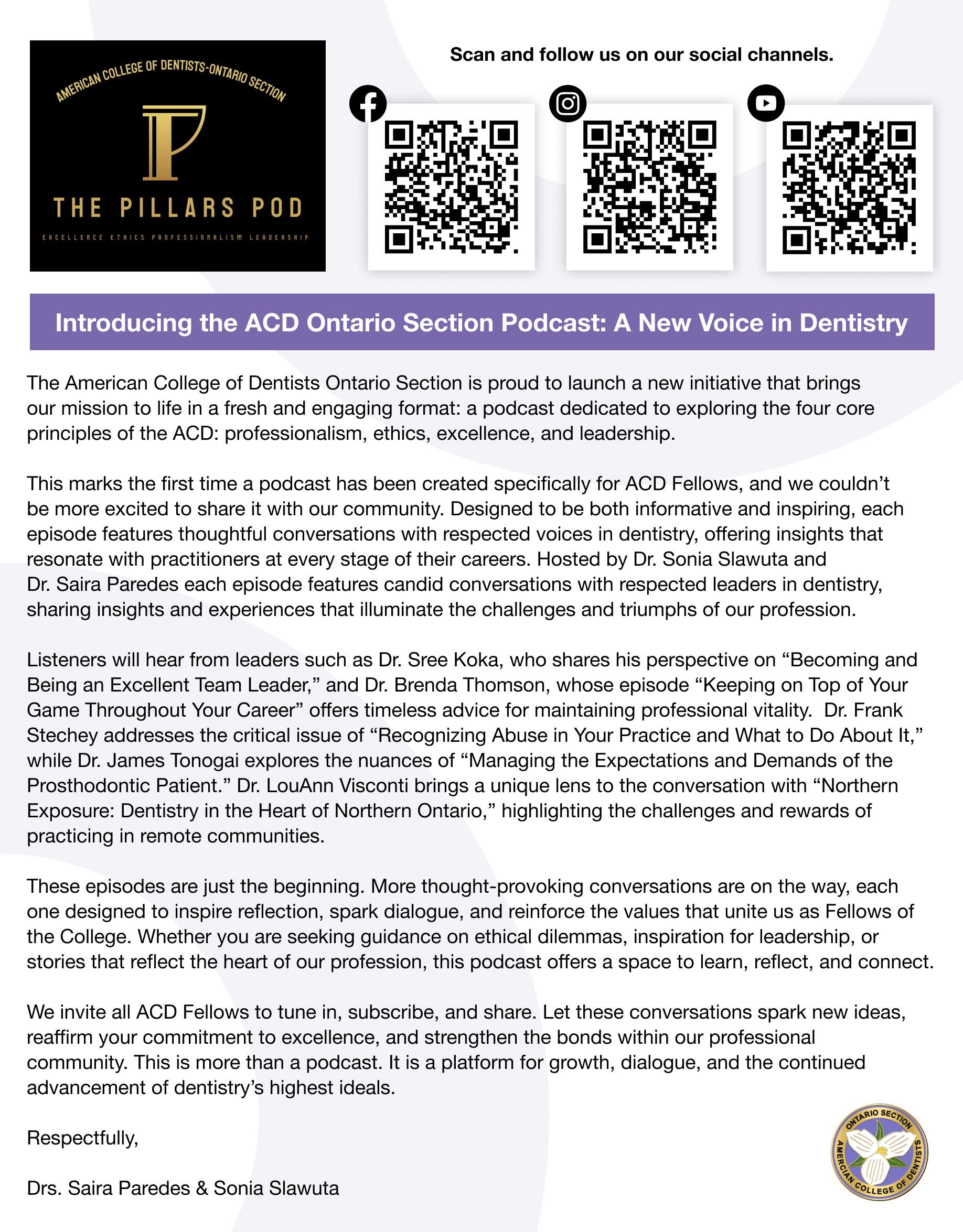 of The Pillars Pod, a podcast initiative designed to extend the ACD’s mission of advancing ethics, professionalism, leadership, and excellence beyond traditional settings. Introduced by Dr. Slawuta and Dr. Paredes, the series takes its name from the four pillars of the American College of Dentists and aims to spark thoughtful conversations about the values that guide dental professionals in practice and in life. Each episode features Fellows, educators, and emerging leaders sharing personal insights and real-world stories about ethical challenges, professional growth, and service to others.
