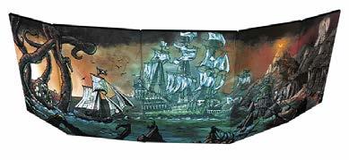 The official Gamemaster screen for PIRATE BORG. A 5-panel screen featuring original artwork with glow-in-the-dark features on the front, and a collection of GM tables and info on the back. The screen folds down to A5 (the same dimensions as the core book). The GM-facing side contains NPC and vessel name generators, quick pirate and ship stat blocks, ASH and gear tables, ritual and relic rules, a ship diagram, naval combat stats, core rules references, and more.