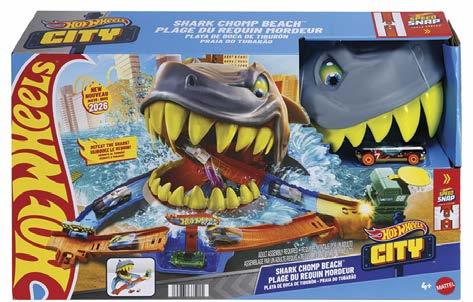 Hot Wheels: City: Shark Beach Battle (2) √ Kids and their Hot Wheels toy cars take on a hungry shark nemesis in the Hot Wheels City Shark Chomp Beach Playset. Adjust the pivoting launcher to take one of two paths: stunt over a gap jump to avoid the shark, or take direct aim at it with a full figure-8 stunt. The trick is to launch cars hard enough to escape unscathed and knock the shark out. With a simple reset, kids can take the challenge again. The set features Speed Snap Track System connection points to attach it to other tracks and sets. One die-cast Hot Wheels car is included.