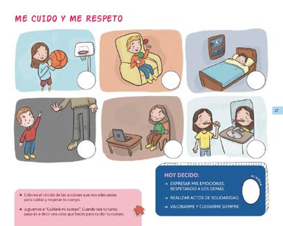 Se buscó utilizar un lenguaje simple, cercano y directo, entendiendo que la mayoría de los niños aún no han desarrollado el proceso de lectoescritura a los 4 y 5 años. En el cuadernillo del estudiante se dio prioridad a brindar el mayor espacio posible para que los niños puedan desarrollar las actividades con libertad.