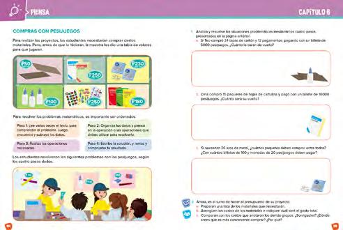 Piensa. Pretende relacionar el tema del capítulo con el área de Matemática. Muchas veces, no se da una integración natural; por eso se introducen los itinerarios. No se sugiere una forma determinada de enseñar numeración y cálculo, debido a que el libro pretende llegar a la heterogeneidad de los docentes y respetar su metodología de trabajo. Sí se presentan actividades que incentiven el razonamiento. En la medida de lo posible, se introducen situaciones problemáticas en el contexto del desarrollo del proyecto elegido. Tam bién, en el caso de Matemática se propone abordarlas como instrumentales, desarrollando los diferentes contenidos para satisfacer las necesidades del proyecto seleccionado.