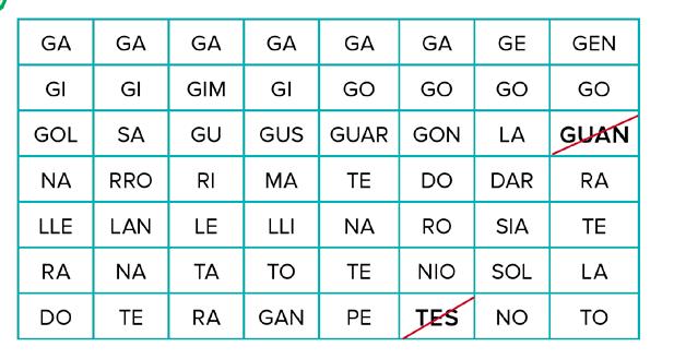 GALANTE; GALERA; GALLETA; GALLINA; GATO; GANADO; GENIO; GENTE; GIRASOL; GIRO; GIMNASIA; GIGANTE; GOLPE; GÓNDOLA; GORRO; GORILA; GOMA; GOTERA; GUANTES; GUARDAR; GUSANO; GUSTO