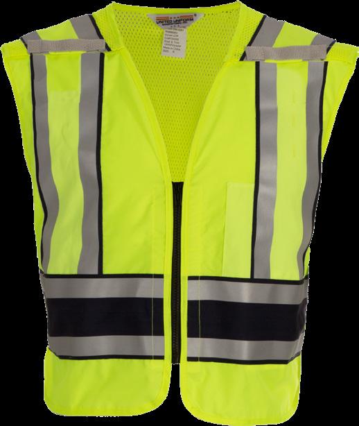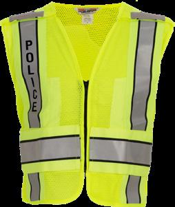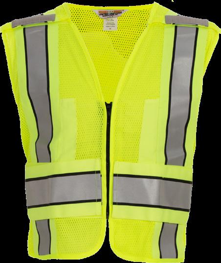 Six point Hook + loop breakaway system: One on shoulders, One at sides, Two at zippered front Grosgrain stripe with dual reflective stripes for maximum visibility