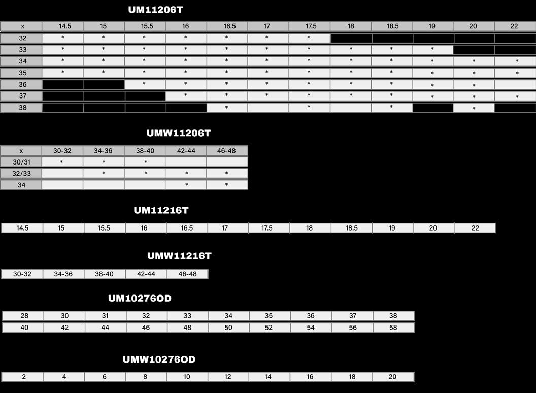 sizing XXS XS S M L XL 2XL 3XL 4XL 5XL 6XL 12-12.5 13-13.5 14-14.5 15-15.5 16-16.5 17-17.5 18-18.5 19-20 21 22 23 30/31 • • • • • • 32/33 • • • • • • • • 34/35 • • • • • • • • • 36/37 • • • • • • • • A2