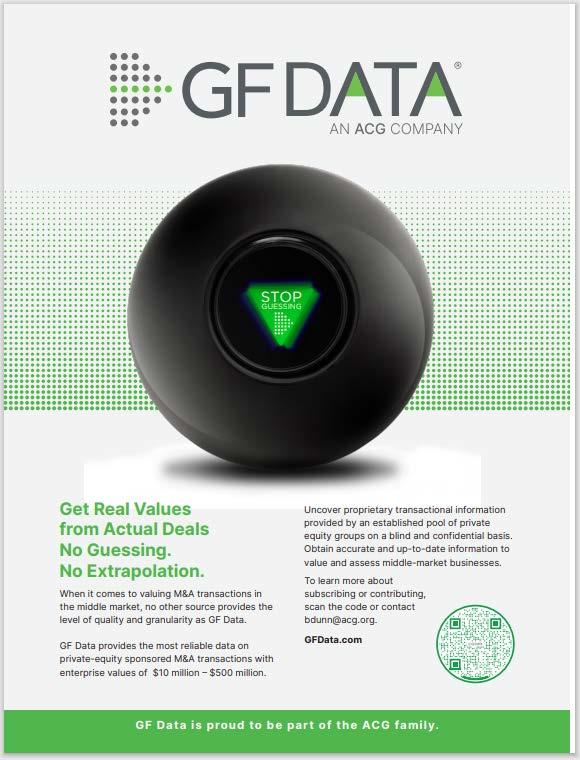 Did you know that GF Data, a powerful middlemarket private equity valuation database, is an ACG company? GF Data publishes quarterly reports on M&A, leverage, and key deal terms and provides an online valuation database with continuously available valuation comps organized by the NAICS industry code. Visit gfdata.com, email info@gfdata.com, or call 610- 616- 4607 for more information.