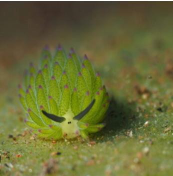 The Leaf sheep is a sea slug. It has two dark eyes and have two horns on the top of their heads. They are green. Leaf sheep live near the top of the ocean that is 9 to 18 meters deep. Leaf sheep also have predators, just like the puffer fish and the dumbo octopus. They have to be careful as fish, crabs, sea stars and sea spiders all like to eat leaf sheep.