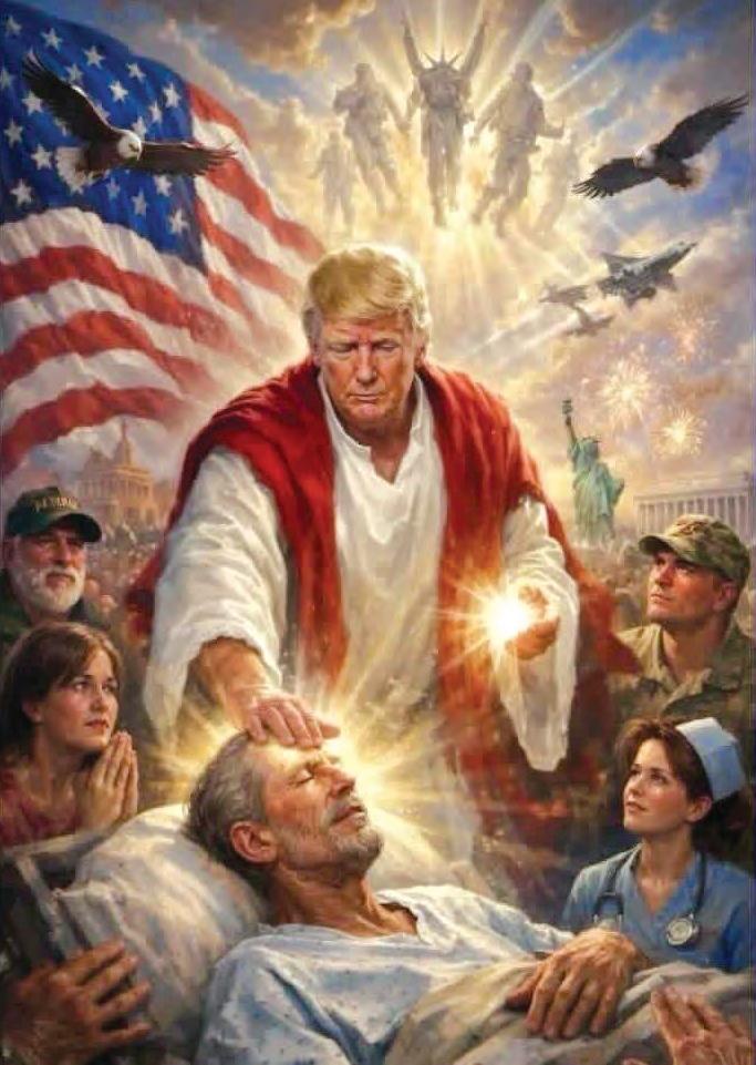 Imagem de inteligência artificial publicada por Trump mostra o presidente em representação religiosa cercado por símbolos políticos e militares