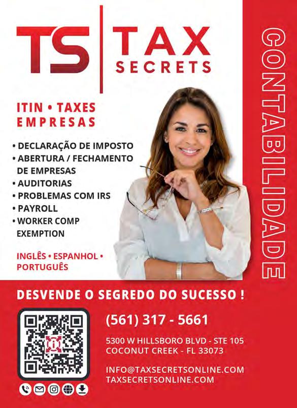ITIN / TAXES / EMPRESAS - Declaração de Imposto; Abertura e fechamento de empresas; Auditorias; Problemas com IRS; Payroll; Serviços de Contabilidade; Worker Comp. Exemption. 5300 W Hillsboro Blvd Suite 105, Coconut Creek, FL 33073 TEL: (561) 317-5661 • www.taxsecretsonline.com • docs@taxsecretsonline.com