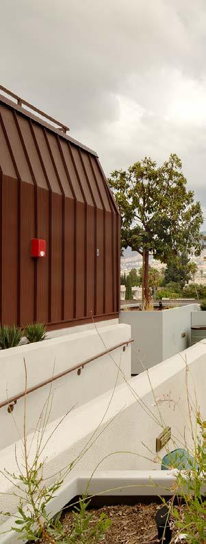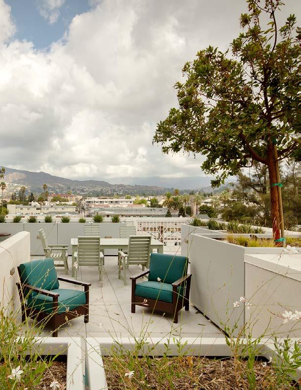 The contemporary design of the five-story structure features bold yet harmonious architectural elements inspired by the local context. Soft wood tones naturally blend well with the site’s surrounding landscape and mountain backdrop. Strong horizontality is a key characteristic in Craftsman and Prairiestyle homes which are prevalent in the surrounding neighborhood. Horizontal design elements help to reduce the building’s vertical scale while adding hints of modernism. Concrete breeze block, commonly used in mid-century modern design, is utilized as a visual screening element to an open parking garage along Figueroa Drive.