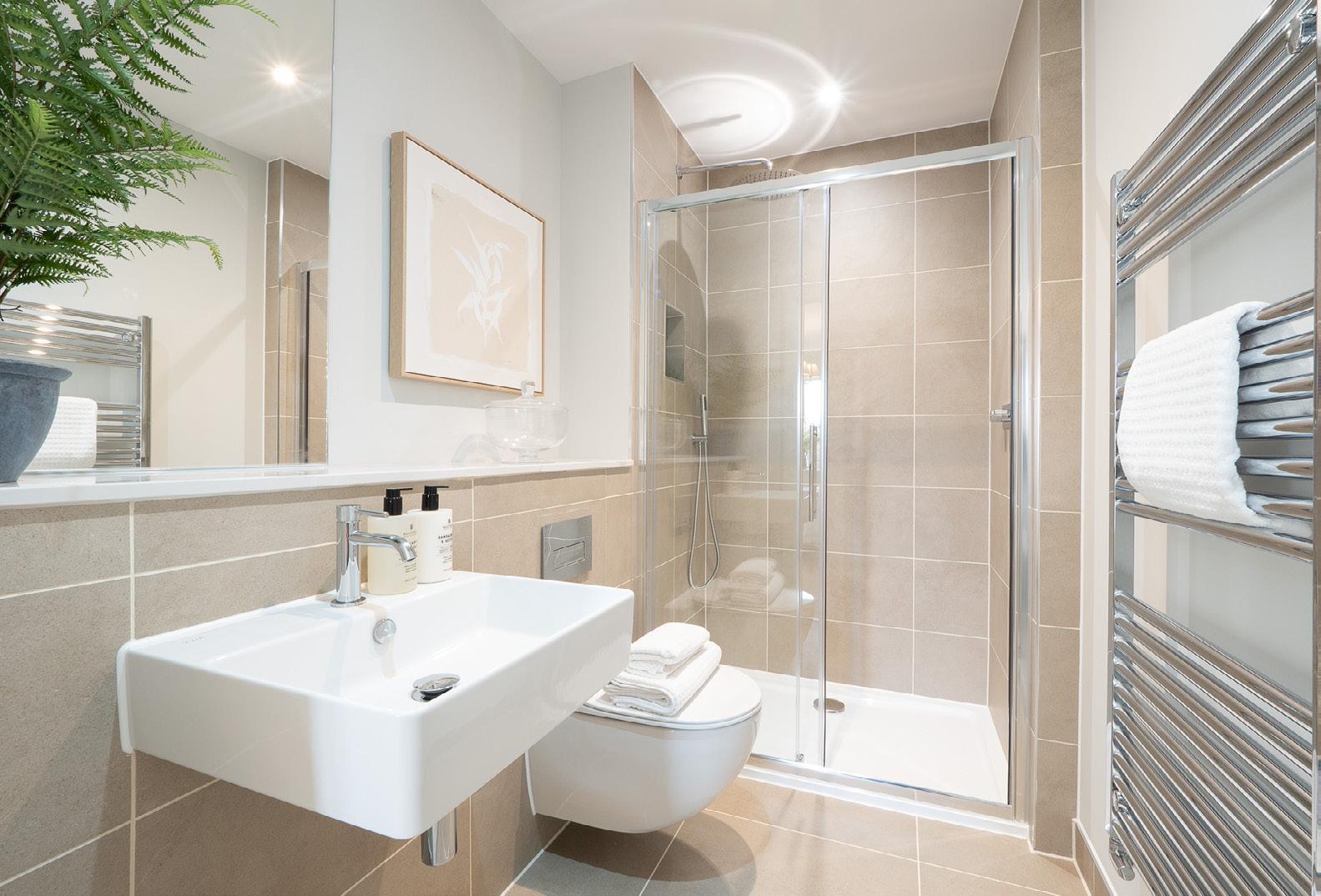 • Full-height porcelain wall tiling around bath and shower, and behind sink