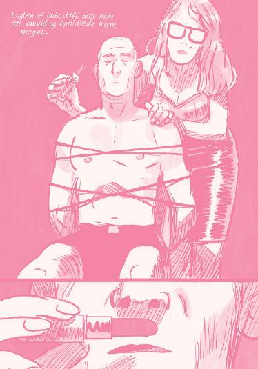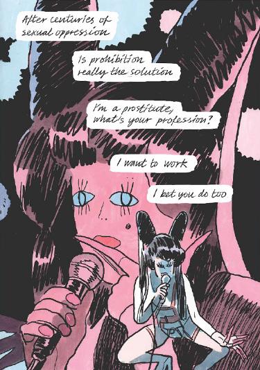Qui est Dasa Hink ? Si, sur la scène berlinoise, Dasa est chanteuse et performeuse, le jour, elle n’a pas un métier tout à fait comme les autres. Après avoir travaillé pendant quinze ans en tant que serveuse, elle en a eu assez de trimer dans divers bars et cafés, et a décidé de répondre à une petite annonce. C’est ainsi qu’elle est devenue dominatrice dans un studio BDSM ou, en d’autres mots, une travailleuse du sexe. Et cette vie lui convient parfaitement. Revêtir ses différents accessoires lui donne confiance en elle et, plus que tout, elle aime être à l’écoute de ses clientes et clients, pour apprendre à les connaître et les aider à s’abandonner le temps de quelques heures, entre plaisir et douleur. Mais Dasa mène aussi une vie qui ressemble à celle de tout le monde : elle adore faire la cuisine, boire des verres avec ses amis le soir et donner toute une kyrielle de surnoms au chat avec qui elle partage son appartement. Dans cette incroyable bande dessinée documentaire, la journaliste Anna Rakhmanko et l’illustrateur Mikkel Sommer donnent pleinement la parole à Dasa, pour nous faire découvrir, à travers ses yeux, une série de personnages bigarrés et hauts en couleur, qui jettent un autre éclairage sur le rapport que nous tissons avec notre propre sexualité. Alternant gros plans et portraits où le rose et le bleu prédominent, Rakhmanko et Sommer nous laissent entrapercevoir toute une palette de désirs, loin des clichés réducteurs qui sont souvent véhiculés dans notre société.